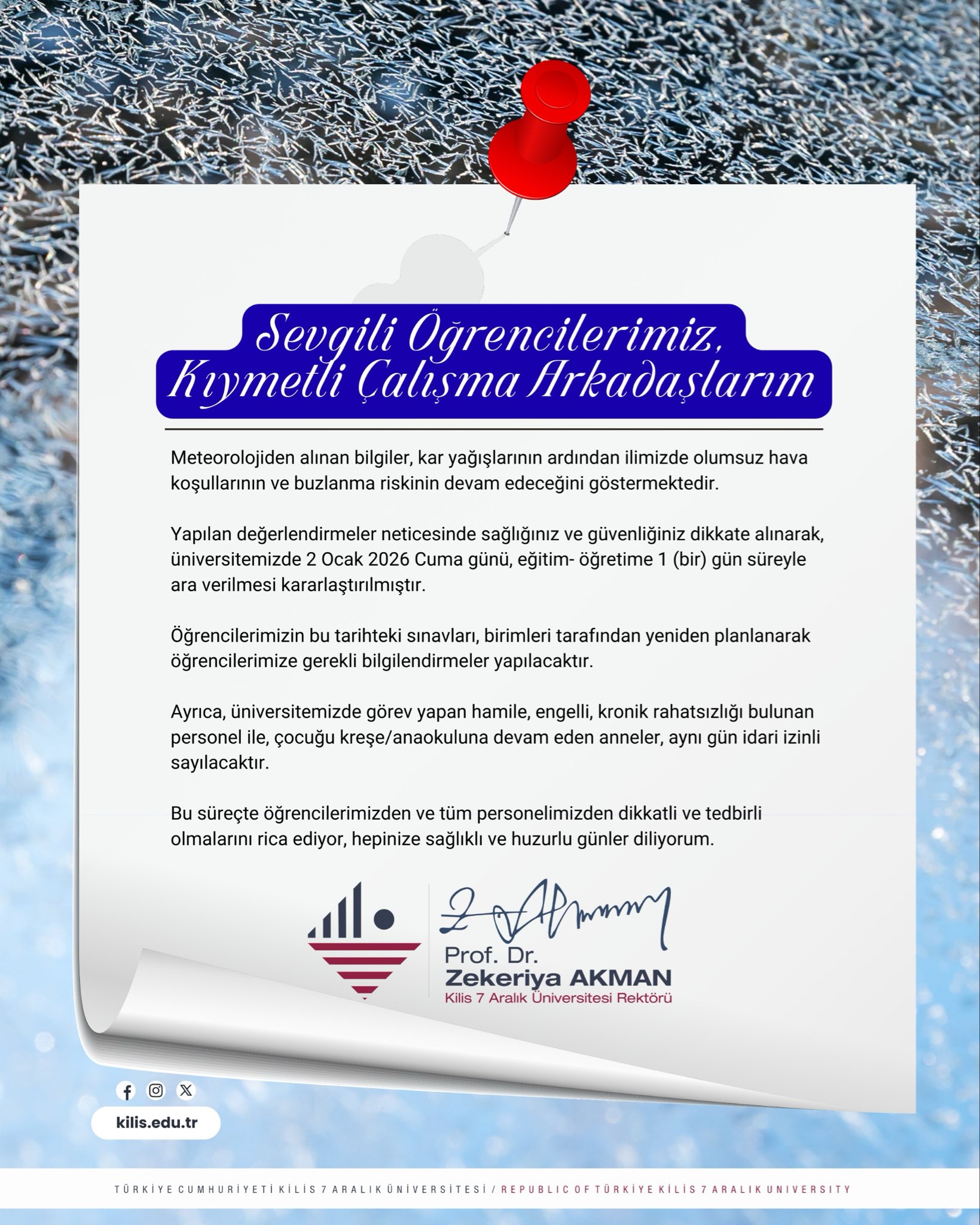 Olumsuz Hava Koşulları Nedeniyle Üniversitemizde Eğitime Ara Verilmesi